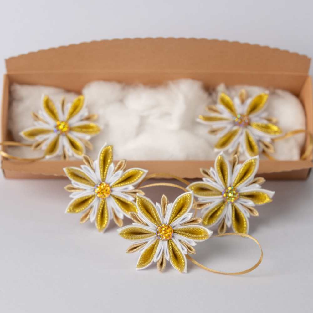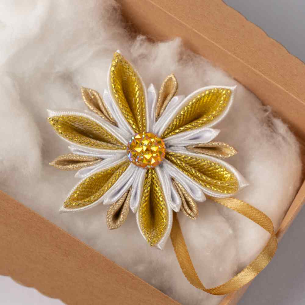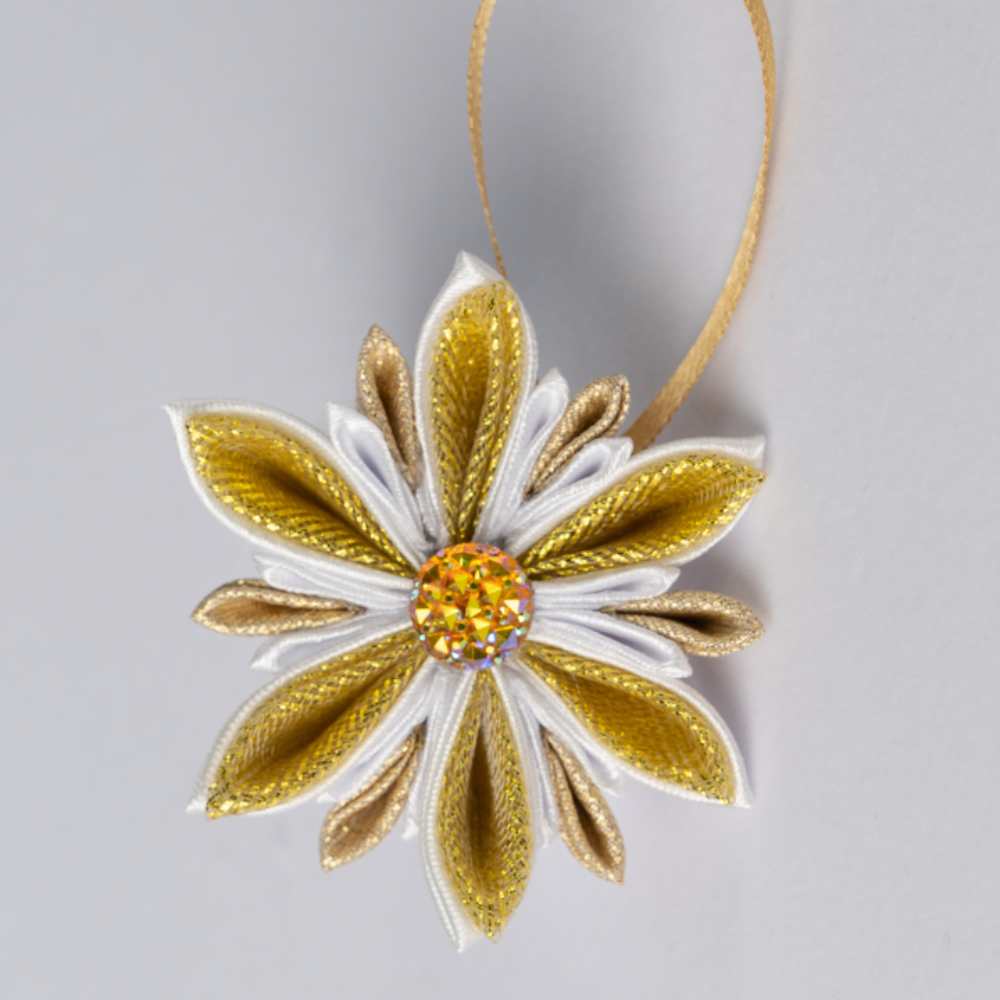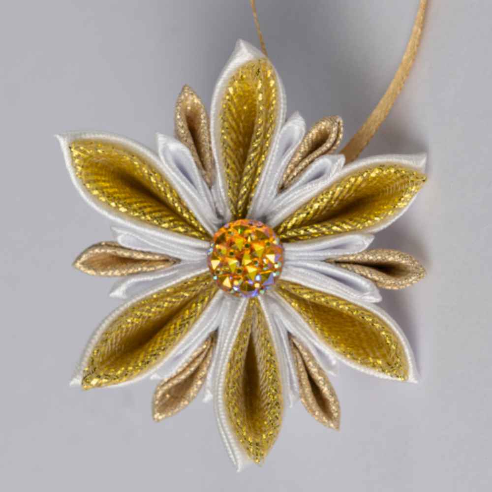 Siena je narejena iz 5 cm širokega satenastega traku, bleščečega zlatega in belega traku. Satenast trak 5×5 cm je zložen in dodelan tako, da dobimo izgled »čolnička«, kot jaz pravim temu delu. Potrebujemo 6 podobnih »čolničkov«, katere zlepim skupaj v eno rožico.